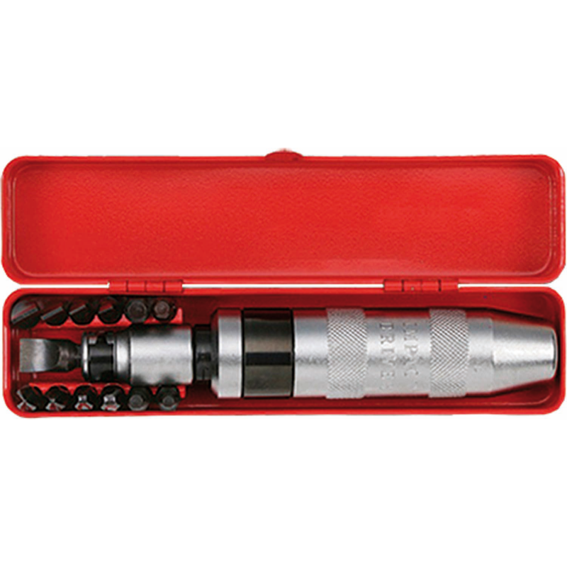 Práctico destornillador a golpe de excelente calidad, se suministra con un juego de 13 puntas. Apto para motocicletas, coches, etc. Entregado en cómodo estuche para facilitar su guardado y transporte.