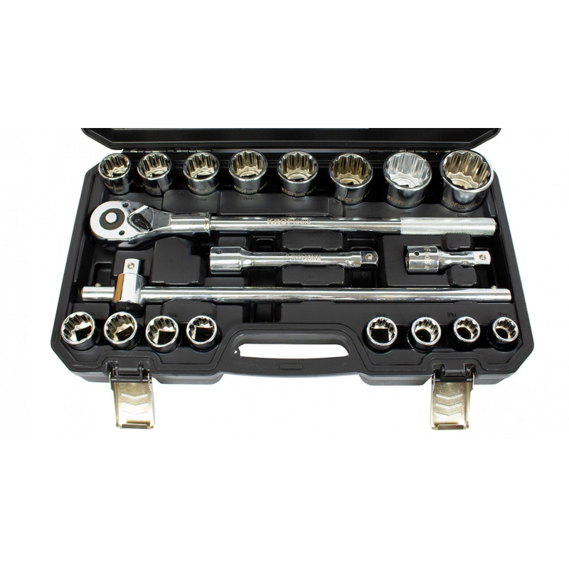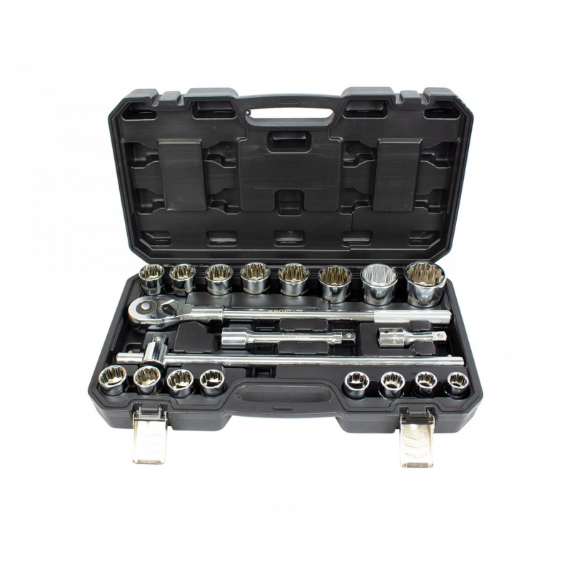 JUEGO AUTOCLE CONEXION 3/4" DEL VASO DE 19MM A 50MM. DE 12 CARAS, COMPUESTO DE MANGO CORREDICO, NUDO ARTICULADOALARGADERAS CORTA Y LARGA, EN ESTUCHE DE PLASTICO. 20 PIEZAS. LLAVES DE 19,21,22,23,24,26,27,29,30,32,35,36,38,41,46 Y 50MM. ALARGADERA CORTA DE 200MM Y LARGA DE 400 MM. MATERIAL: ACERO CROMO VANADIUM. PUEDE VARIAR EL COLOR DE LA CAJA(AZUL)