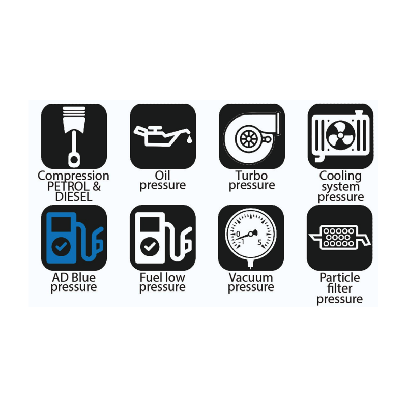 Este kit capaz de medir la compresión en motores diésel y gasolina, la presión del aceite, la presión del turbo, la presión del sistema de refrigeración, la presión del AD Blue, la baja presión del combustible, la presión del vacío y la presión del filtro de partículas.