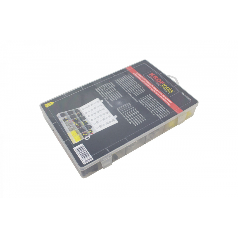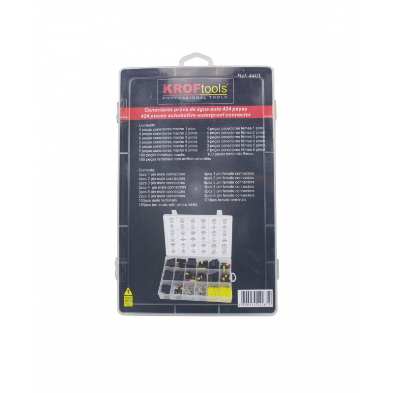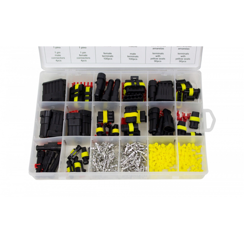 JUEGO CONECTORES A PRUEBA DE AGUA , 424 PIEZAS. COMPUESTO DE... 4 CONECTORES MACHO, DE 1 PIN, 4 CONECTRES HEMBRA DE 1 PIN, 4 CONECTORES MACHO DE 2 PIN, 4 CONECTORES HEMBRA DE 2 PIN, 4 CONECTORES MACHO DE 3 PIN, 4 CONECTORES HEMBRA DE 3 PIN, 4 CONECTORES MACHO DE 4 PIN, 4 CONECTORES HEMBRA DE 4 PIN,100 TERMINALES MACHO, 10 TERMINALES HEMBRA, 180 TERMINALES HEMBRA CON ARANDELAS AMARILLAS.